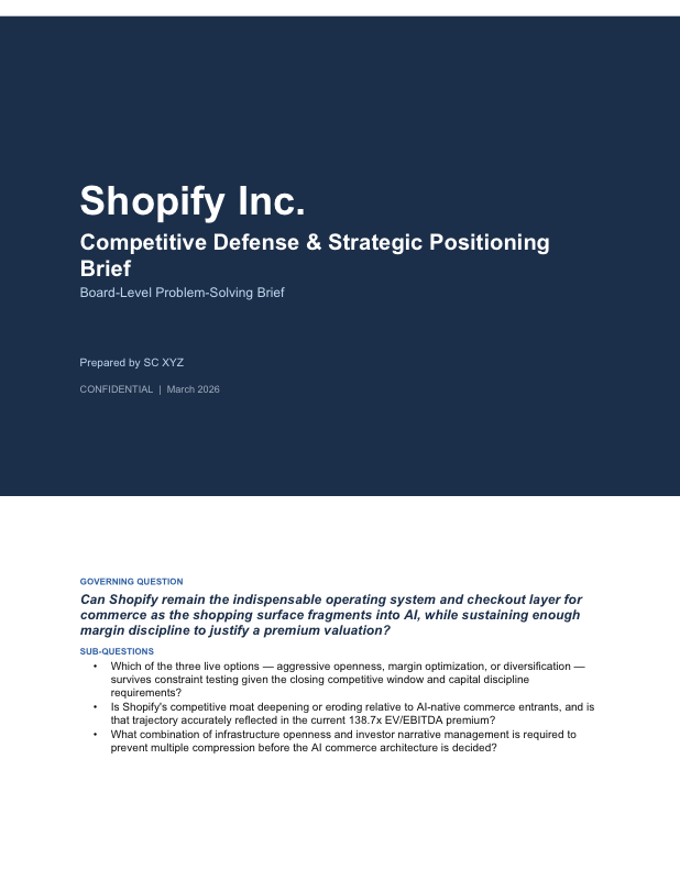 Board memo, executive deck, or both. Brand it with your firm name. Review your inputs, pay, and we generate a board-ready deliverable — answer-first structure, MECE diagnostics, implementation roadmap — in under 10 minutes.